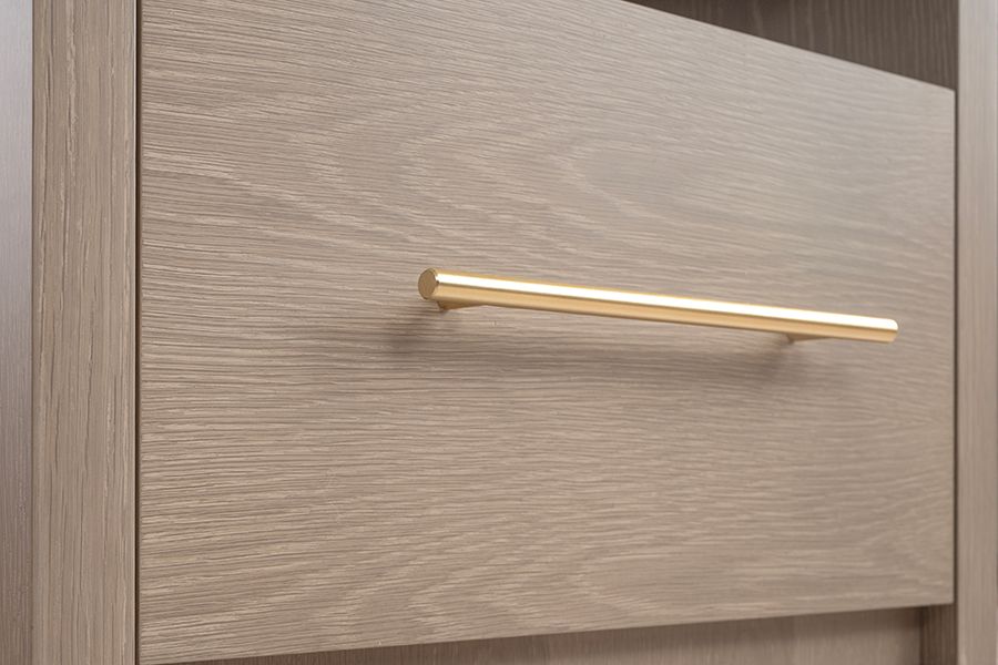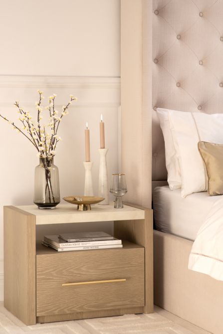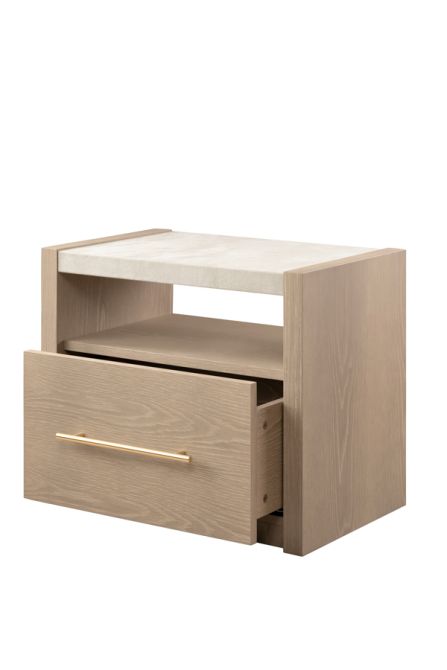 Introducing a luxury bedside table that makes a bold statement, inspired by upscale American interiors. This piece boasts a chic, neutral faux shagreen-wrapped top shelf, complemented by a warm grey washed oak veneer body. It features a generously sized drawer equipped with soft-close runners for smooth operation. The stainless steel handle, finished in a delicate brushed gold, adds a touch of sophistication. Supplied fully assembled for your convenience—just attach the handle to complete the look.