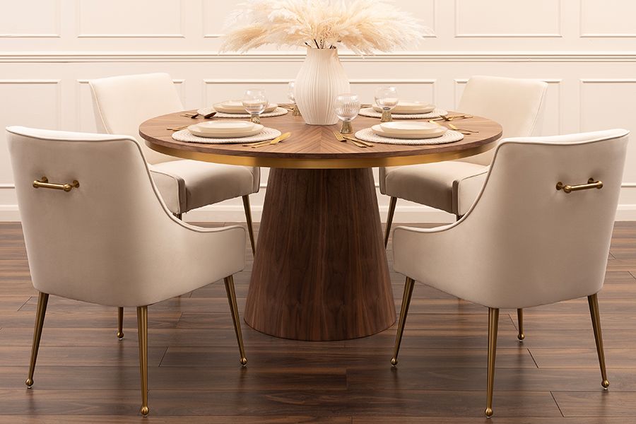 A spacious and striking dining table available in two sizes: one that comfortably seats up to 6 guests and another that seats up to 8 guests.