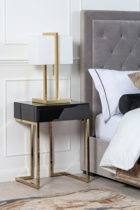 An elegantly proportioned bedside table. Toughened glass top with beveled edges and concealed drawer, making this suitable for use as a living room side table