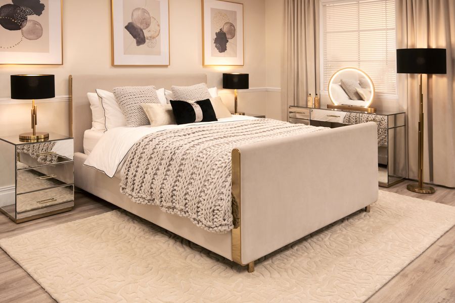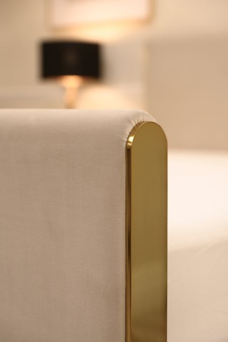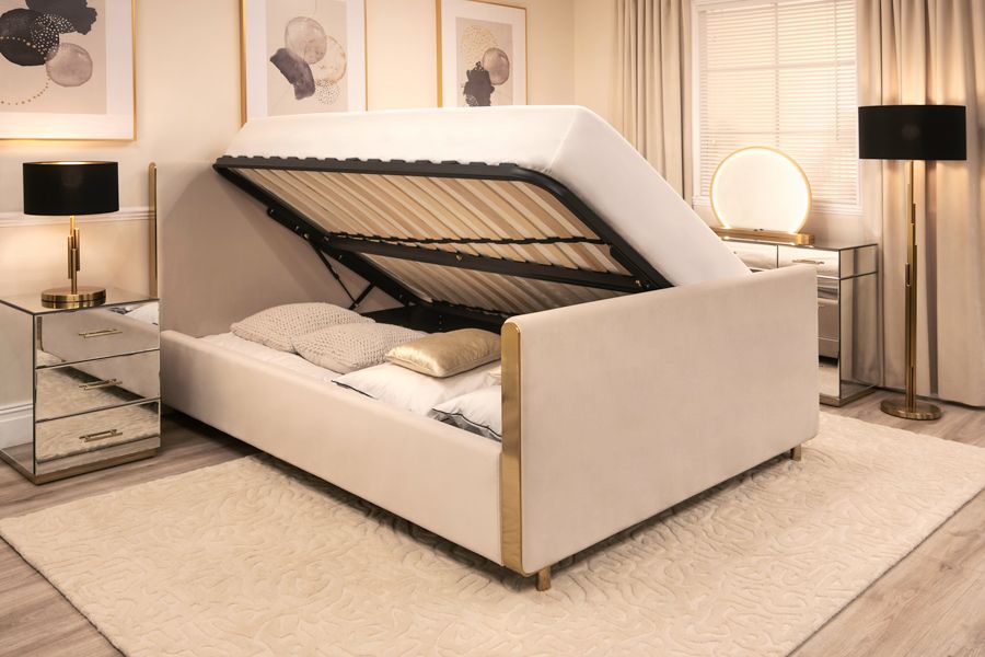 The Maceo storage bed features an understated contemporary design with exquisite metal details. It showcases solid steel wraparound trim and feet, finished in polished brass, and is upholstered in sumptuous velvet fabric. The bed includes a generous internal storage area, perfect for keeping spare bedding, cushions, suitcases, and more. A gas lift mechanism ensures easy opening. Available in a range of colors and dimensions to suit your style and space.