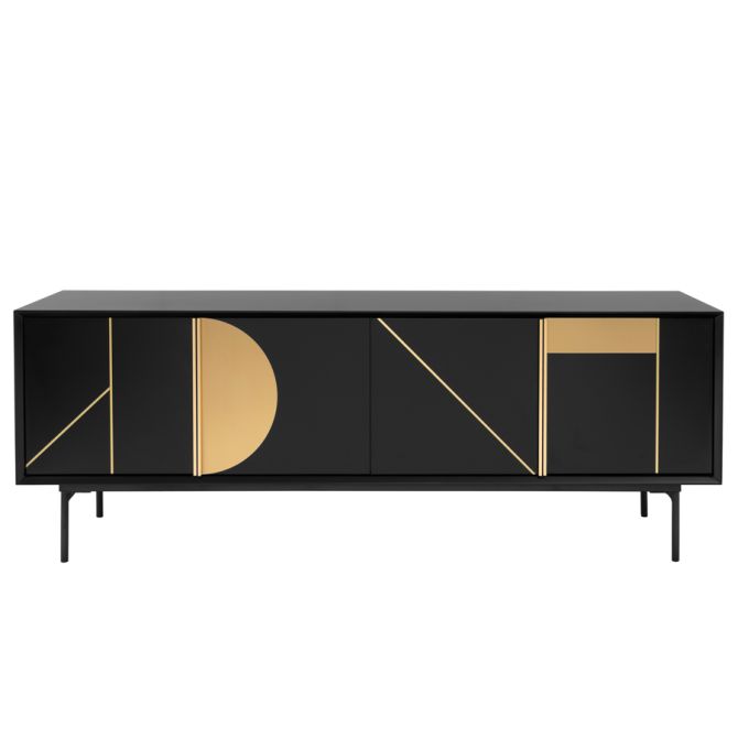 The Large Origami Media Sideboard features a striking design with inlaid matte brass details that enhance its modern aesthetic. The body, doors, and shelves are finished in durable black polyurethane paint, while the steel base boasts a sleek black powder-coated finish. It includes four doors with elegant matte brass handles and two fixed internal shelves, offering both style and practical storage for your media essentials.